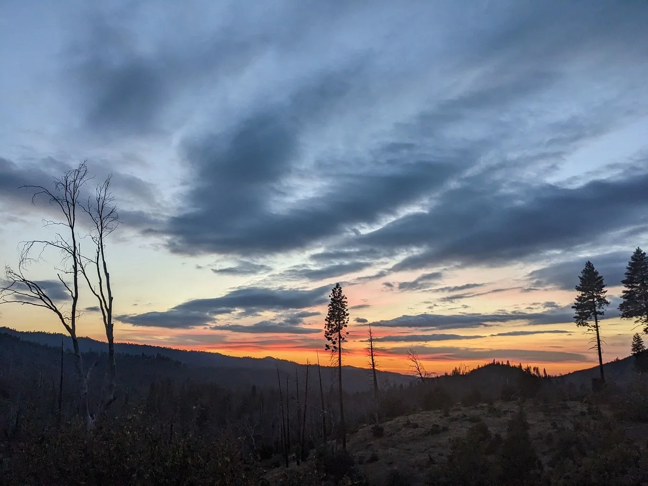 I left my sacred space by the river and started toward my friends back in Yosemite for craft night. As I was driving along the forest service road, I saw the sunset over my shoulder. It stopped me in my tracks!