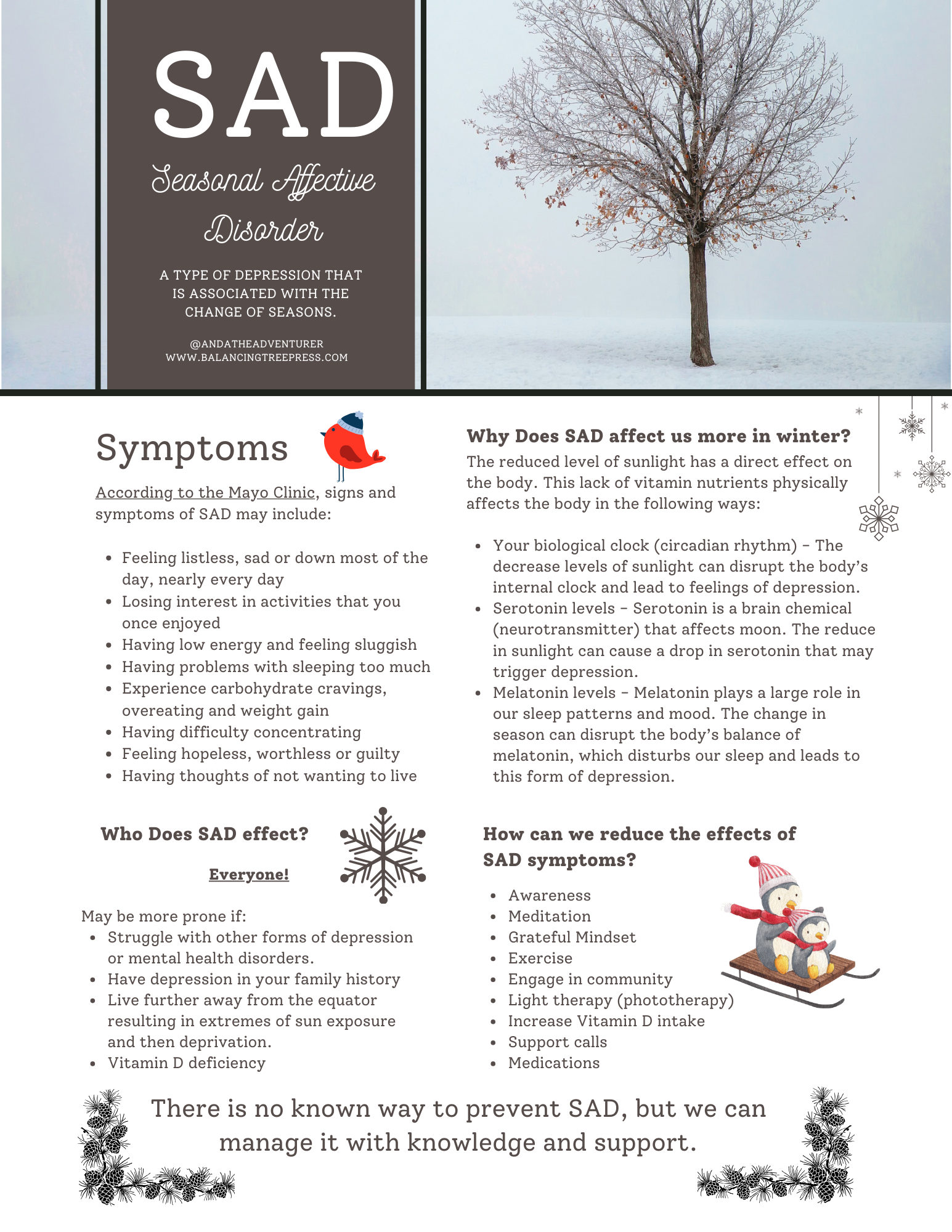 Seasonal affective disorder, or SAD, is a type of depression that triggers based on the change of seasons. Typically it starts in fall and continues into the winter months. It may also start in spring and continue through summer. You may notice a drop in energy levels and feeling more moody for seemingly no reason.
